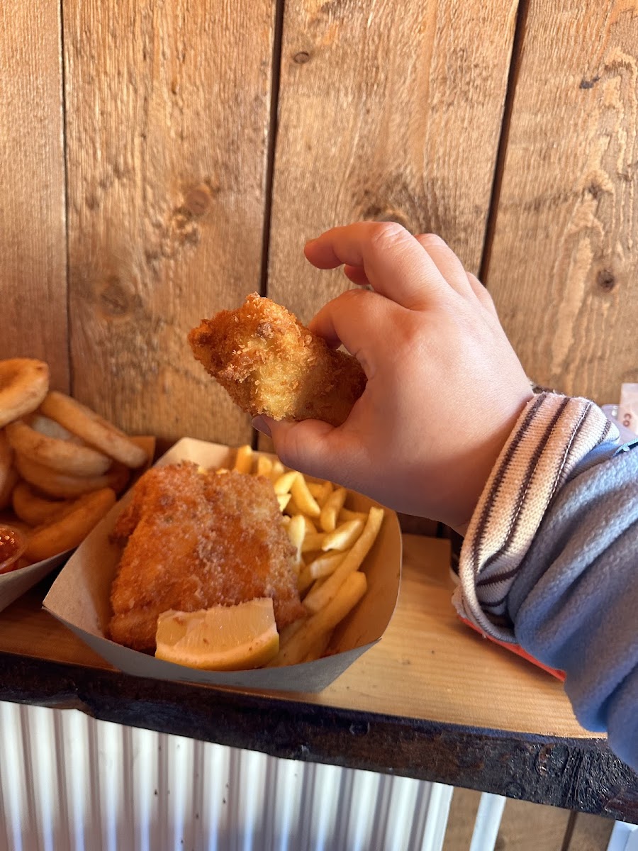 Fish and chips walk up at a campground building. Food was amazing!! Had an americano as well. Warm, clean, simple indoor seating but really delicious.